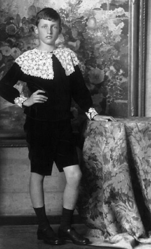 We do not yet have much information on Prince Ludwig's childhood clothing. As best we can tell as a younger boy Ludwig was dressed in the fancy styles common with Bavarian royalty at the time. We can see the various styles with the clothes worn by the children of Crown Prince Ruprecht. We have fewer actual images of Prince Ludwig. The images taken during World War I show him as a younger boy wearing the same styles as his royal cousins. We see fancy blouses with big collar and velvet Fauntleroy styled suits. The fancy blouse seen on the previous page is a good example. After the War, the Wittelsbachs lost power. This affected their social sranding and wealth. As a result, of an agreement with the Bavarian Government (1923), however, they retained a great deal of property and thus wealth. The children thus continued to lead a very affluent lifestyle which included fancy clohes. Thus we see Ludwig as he approached his teen years still wearing a velvet Fauntleroy suit and elaborate lace collar (figure 1). There is a difference, however, he wears ankle socks rather than stockings. We at first thought he ws wearing low-cut oxfords rather than strap shoes, but on closer examination they are sra shoes which were fairly common in Germany at the time. We note other aristocratic boys in Germany who continued to be dressed in fancy outfits after the War, although usully not quite as fancy as the Wittelsbach children.