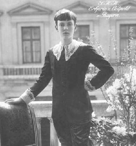 Luitpold also wore knickers suits with lace collar. Several portraits were taken of him in these suits. The portraits were probably taken about 1912-13, shortly before his untimely death. He certainly looks healthy. He looks to be about 11-12 years old. He may have even worn this suit at 13 years of age. He wears both a light and dark colored satin suit. The light-colored suits had the same lace collars that he wore woth the kneepants suits. The dark satin knicker suit had a large pointed lace collar. In some of the portraits it is difficult to make out the material. In others, however, it looks very much like it is a satin suit. It is clearly a dark color, but does not look to be black. I'm not sure what color the suit was. The rather long jacket is plain. It has large buttons which button at the collar. While the jacket is plain, it is worn with a large pointed lace collar and matching wrist cuffs. Some of the knickers suits, like the kneepants suit were done in the button-on style. The pants look to be knickers. They clearly button or buckle over the knee, but do not blouse out much. We do not have any images of him wearing these dark sits with above the knee kneepants. They were worn with dark long stockings.
