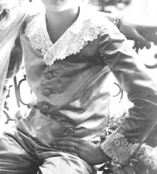 The light-colored knickers suit looks very similar to his kneepants suit. They are clearly made in satin. There may have only been one of these light-colored knickers suits. The jacket is made with an open collar and has large satin-covered buttons. The outfit had the same lace collars and matching wrist trim that he wore with the kneepants suits. Some of the knickers suits, like the kneepants suit were done in the button-on style. We did not notice at first that hechad begin wearing his light-colored suits with knickers, but enlargements of available images confirm this. This is difficult to follow because not all the portraits were taken full length, so we sometimes do not know the type of pants that he was wearin. There may have been only one suit. We do not think that this suit was white or even cream. It may have been a light blue, but we can not be sure with the available black and white image. He looks to have been about 11 years old when he wore this suit, probably in 1912.