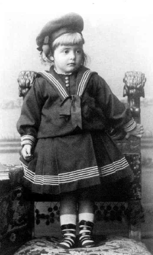 As a todler here we see Princess Alice in a sailor dress. The cap was mpre common for boys, but looks rather like a tam that girls fis wear. Notice that there is not tally (cap Band). There is just a hint of lace on the dickey. Her strap shoes have five bars. As an older girl she wore dresses, but not sailor dresses.