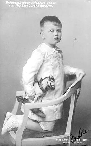 Friedrich had three siblings: Christian Ludwig, Duke of Mecklenburg-Schwerin (1912- ), Thyra, Duchess of Mecklenburg-Schwerin (1919- ), and Anastasia, Princess Friedrich Ferdinand of Schleswig-Holstein-Sonderburg-Glücksburg (1922- ). Family portraits show him wearing tunic suits with kneepants as a younger boy.
