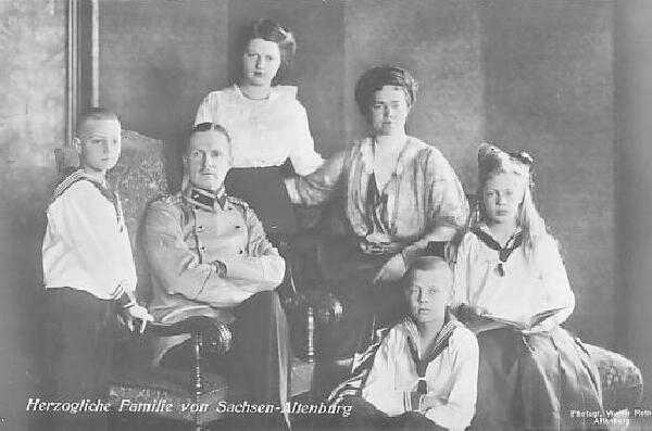 Duke Ernst Duchess Adelheid had four children, two boys and two girls. The children are: Hereditary Duke Georg-Moritz (1900-1991), Prince Friedrich-Ernst (1905-1985), Princess Charlotte (1899-1989), and Princess Elisabeth (1903-1991). The oldest was Princess Charlotte and the youngest Prince Friderich-Ernst. The images suggest a very close family, but we have no actual information. Duchess Adelheid clearly had apreference for sailor suits. Notice Elizabeth's rather wlaborate hair style here about 1913 (figure 1).