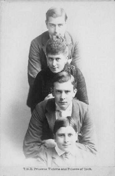 The Duke of Teck sold his lands in 1381 to the counts of Württemberg. The title of Duke of Teck was then in 1495 the basis for the elevation of the earldom (or county) of Württemberg to a duchy. After 1498 the principality passed to the Dukes of Württenberg. The title of Duke of Teck was handed down to the English royal family through a Württemberg collateral line. Here are the Teck siblings: Prince Francis of Teck (1870-1910), Princess Mary of Teck (1867-1953), Prince Adolphus of Teck (1868-1927) and Prince Alexander of Teck (1874-1957), better know as the Earl of Athlone) (figure 1). They are the children of Duke Franz von Teck (1837-1900) and Mary, Princess of Cambridge (1833-97). The Teck dynasty is best known today because of its relationship to the British royal family. The Prince of Wales, Prince Albert Victor Christian Edward, Duke of Clarence became engaged to Princess May of Teck, but before the marriage occurred, he died of typhoid fever. As the arrangements had been made and the Prince's family were taken with Princess May, she was in effect passed on as fiancée to Albert Victor's younger brother George (later, George V). Princess Mary of Württenberg (Teck) married the English Duke of York in 1893. The Duke became King George V and the Princess, Queen Mary, mother of both King Edward VIII and George VI.