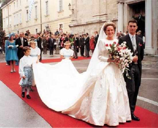 I'm not sure at this time how Duke Philipp fits into the royal line. Duke Philipp of Wurttemberg married Duchess Marie Caroline in Bavaria. The image is noted 1969 and 1964. I am not sure what the dates refer to, perhaps their birth dates. The wedding portrait shows what looks like the ring bearer and flower girls. The girlscwear wjite dresses and the boy a white blouse with blue knickers. The wedding apparently took place in 1991.