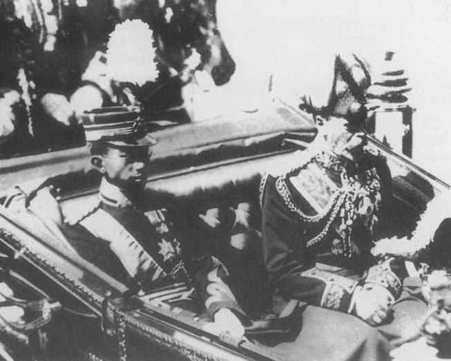 Figure 1.--As a young man, Prince Hirohito made a world tour to introduce him to other countries. Britain was a major port of call. In a photograph taken in London, we see Crown Prince Hirohito riding in a carriage with King George V of England. The photograph was taken on May 9, 1921. Prince Hirohito looks to be wearing a Japanese Army uniform. |