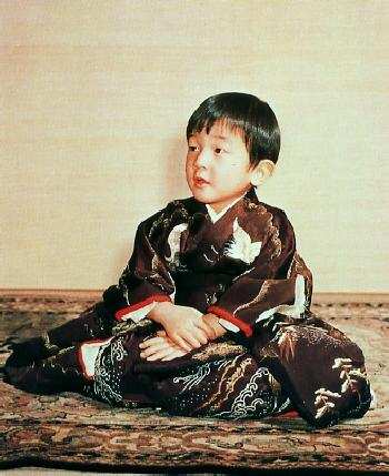 Here is a formal portrait of Prince Naruhito in traditional robes in 1963 (figure 1). The event was Shishigosan. This holiday celebrates children at ages 3, 5, and 7 years old. I am not sure for what events he wore traditional clothing other than these formal portraits and special events. He looks to be about 3 years old.