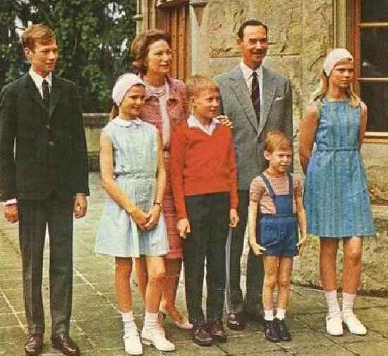 John and Joséphine-Charlotte of Luxembourg had five children, three boys and two girls. We have very little information on their childhoods. Their eldest son Henri Albert Gabriel (1955- ) married Maria Teresa Mestre y Batista (1956- ), daughter of Jose Antonio Mestre and Maria Teresa Batista y Falla (1981). There other children were: Marie-Astrid Liliane (1954- ), Jean Felix Marie Guillaume (1957- ), Margaretha Antonia Marie (1957- ), and Guillaume Marie Louis (1963- ). We know very little about the children at this time. The image here shows the family about 1969 (figure 1). We have some limited information on how the children were dressed.