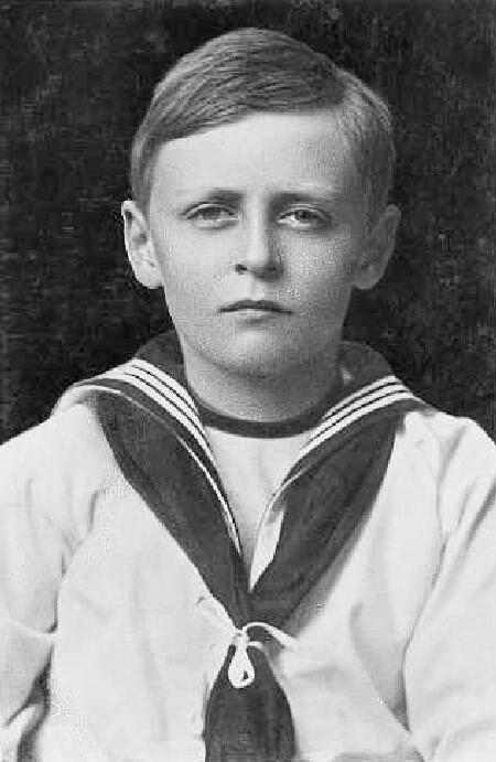 We do note Prince Olav often wearing sailor suits like his English cousins. They were very traditional styled sailor suits. The suits look like British Royal Navy sailor suits. Norway had a very small navy, more of a coast guard force. We do not know to what extent their unifirms differed from the British Royal Navy and if any such difference was reflected in Olav's sailor suits. The ones we note are white suits with long pants. These would presumably be Summer suits. Portraits taken inside, however, do not indicate seasonality. We assume he also wore blue suits during the Winter months. We are unsure what sort of headwear he wore with these suits.