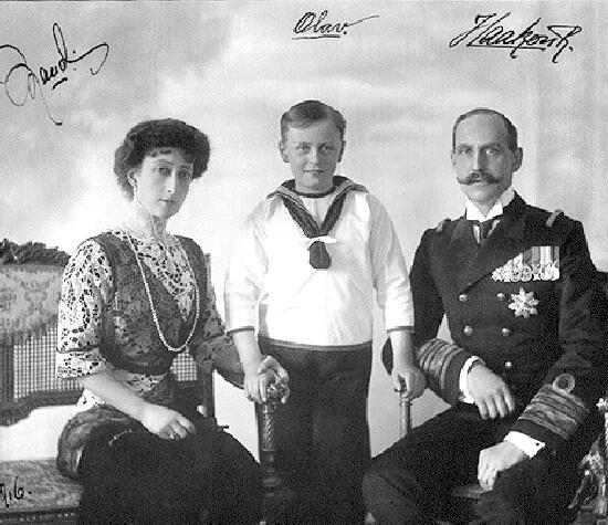 Figure 1.--King Harald and Queen Maud are seen here with their son Prince Olaf. The royal family had strong ties to the British royal family. Queen Maud was a daughter of English King Edward VII. |