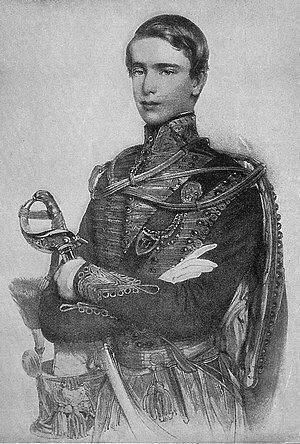 We do not know much about how Franz Josef was dressed as a boy. Our information is limited to availble images and we have been able to find very few. As a little boy he seems to have worn dresses. Here we see him in 1832. He would have been about 2-3 years old. The portrait was painted by Ferdinand Georg Waldmueller. He wears a long white dress with a large white collar. At age 18 we note him wearing an elaborate military uniform. This would have been made about 1848 when he became emperor as a young man.