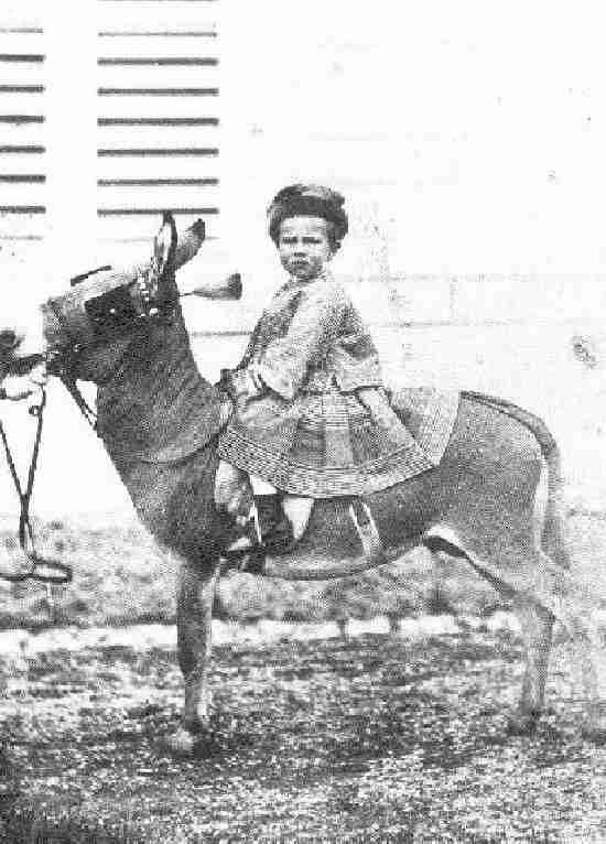 At about age 2 he was wearing a kind of kilt outfit. Rudolf also wore dresses as a boy. There seems to have been some effort to coordinate his clothes with those of his older sister when he was very young. Another image shows him on a donkey with a kind of kilt or skirt suit. While these outfits look rather like kilts or kilt suits they notably were not done in tartan. Nor do we note Highland trapings like sporans.