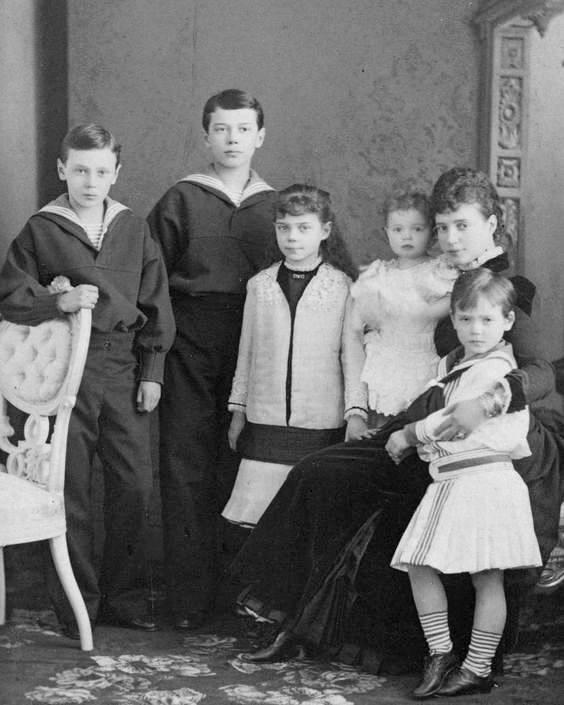 They seemed to have been dressed alike within the limits of the age differences. Nicholas as Tsarevich may have been dressed somewhat fifferently for offical occassions. The boys wore dresses when young. When a little older tghey began wearing sailor outfits. We also see a sailor kilt suits. We notice Michael wearing sailor-styled kilt suits. We are not sure his older brothers wore similat outfits. As older boys they wore sailor suits into their teen years. we do not have a lot of images of the royal family, but the ones we do have show the boys wearing sailor suits. Even for a rather formal occassion, the boys wore sailor suits. Note Grand Duke Michael on the previous page as a teenage boy wearing a sailor outfit. Here all the boys wear sailor outfits (figure 1). The older boys wear dark standard sailor suits. Their little brother Michael, wears a white sailor-styled kilt suit. This by the late-19th century was a strong European influence. The Tsarina was a Danish Princess. We note her brothers commonly wore sailor suits. This was not yet a Russian imperial tradition , but a convention introduced from Denmark by the Tsarina. Styles in Denmark were strongly influenced by Germam styles. The German princes and well as German aristocratic children also commonly wore sailor suits. Nicholas as a young man, in contrast began wearing an army uniform. This may have been only for formal occassions.