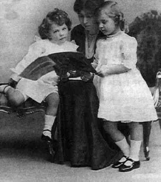 Figure 1.--This 1916 photograph shows Prince Bertil and Princess Ingrid Victoria with their mother. Bertil appears to be wear a fancy tunic suit with short pants, short whire socks and strap shoes. |