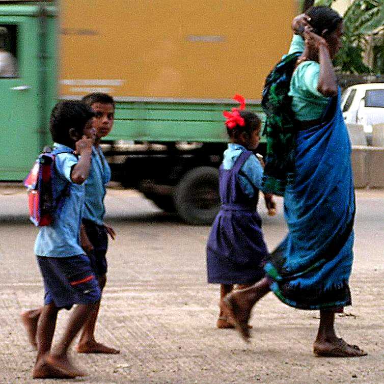 We see Indian students coming and going to school. Most children walk to school, especially primary school children. India has a very youthful population with a very large number of children going to school. Thus Indians streets and roads are full of school children in the morning and afternoon. and around noon as many schools are on half-day schedules. There are many primary schools scattered all over rural India, although the small one-room scholols so common in America are unknown. As a result, most children do not have long distances to walk. There are many schools abnd the countryside is often substantially populated. Mother sometimes walk the younger children to school. Many Indian families are large and thus the older children commonly help the younger children to school.