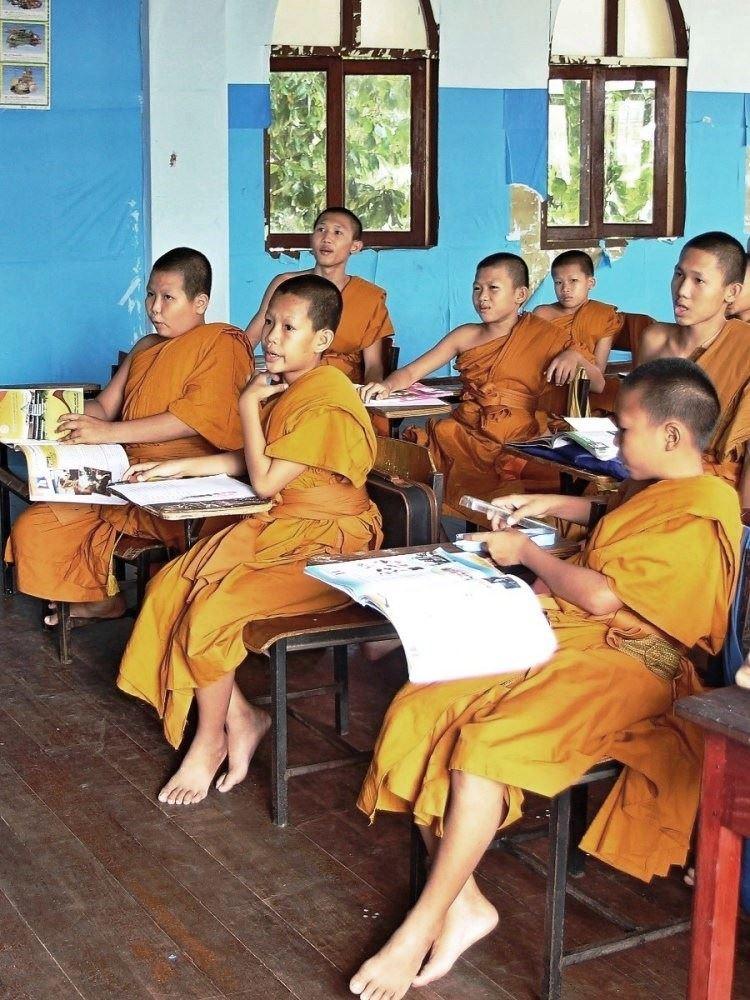An interesting element in Thai education is the Buddhist monastary schools. We do not fully understand the system, but they seem to serve two purposes. The first purpose is to trrain future monks and are long term schools. Traditionally in Thiland before World War II there were few opportunities for poor childre. Becoming a monk was one way for poor boys to get an education and achieve some status in society. The second purpose is to train boys for just ashort period as part of their relgious training, but not to prepare them to be monks. Quite a substantial number of Thai boys have attended these monastic schools for brief periods, often during regular school breaks like summer vacations. While the boys are at these schools they are temporary novices (nen or samanera). They wear the saffron robes, but are cloistered. They are sent into townto beg for food. Thus they are a common sight in Thai cities. They take temporary vows. They may do it during the phansa (rainy season) period, during summer holidays (March - May), or even just for a few days. There are various reasons for this. Some parens want the boys to have basic religious training. Short term study progrms can be to earn make merit after a parent or grandparent has died. This is essentially a repayment of a debt owed to family members who have cared for them when they were little. Boys can be novices beginning at age 8 years, but most are a little older. The monastaries and temples ffer various study programs. One temple has aprogram training the bys in 10 precepts. All programs include training in meditation. Many parents report that the boys completing a novice program are more mature and less commonly have behavioral problems.