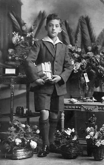 We note an unidentified Belgian boy who apparently had his portrait taken after coming in first in his class (figure 1). Noitice all the flowers set up for the portrait. Presumably they were used for other boys who received school awards, we are not sure about that. We doubt if famiky and friends sent all those flowers. And it is definitely a studio potrtrait. He boy wears a single-breasted short pants suit. The jacket has wide lpoels. He weare the shirt with an opoen (Schiller) cvollar. The knee socks have a narrow pattern bsnd on the turn-over-tops. We are not sure this is how he dressed for school, ut the fact he is holding hos school books shows thast this is a school portrait. Apparently school satchels wrre not very ciommon in Belgium. The boy looks to be about 11-years old. The portrait is undated, but looks to have been taken about 1935.