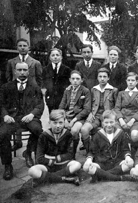 Belgian school children for the most part did not wear actual school uniforms. We note some schools portraits, however, in the 1920s and 30s which suggest that there were some requirements, perhaps more commonly at private than state schools. A case in point is the school class seen here in 1926 (figure 1). There is clearly no required uniform. The boys wear several different styles of suits and collars. Two boys even wear sailor suits. While the boys wear a variety of uniforms, we note that as far as we can tell, each of the boys here wears a short pants outfit. This includes the older-looking boy behind the teacher. (You can see that he is wearing kneesocks under the teacher's chair.) Now it may be just that shorts pants were very common. We are not, however, convinced of this. While short pants were common in Belgium for younger teens in the 1920s, they were not exclusively worn. It seems like that if theu were not rquired, that a few of these boys would have tirned up in long pants or knockers.