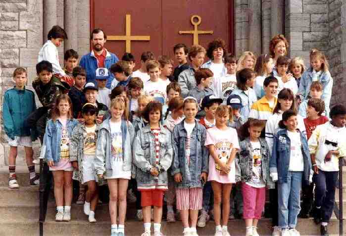 My daughter in the 6th grade at an elementary (primary) school was in an English immersion class even if the school was French . At the end of the year, an exchange with a French immersion English School in Ontario resulted in a travel at Oshawa, near Toronto followed by a visit from the pupils at Pointe-Claire. During this visit, there was a lot of verbal exchanges between kids and a day at Québec City by bus. I pictured all this travel. But my main point in writing you is the group picture I took just before the departure after the week visit in Québec Province. I send you a picture taken ook on the steps of St-Joachim Church. This picture was taken in May 1988 near the end of the school year. Those kids were a delight. Even if different, they are very similar. It is hard to tell who is French or English speaking. There is a good example of the similarities within differences. If we look at the clothing, we see that those children are less distinct between sexes as it was in the 1950s, the 30s and also the 10s. Something like equality or "uniformity" without any uniforms imposed by adults. Those kids were not kiddy, excited or aggressive. They were full of joy and eager to learn. Each of them are also different. We can see all possible style of dressing: long pants, short pants, jeans or skirts, T-shirt, sweat shirt, all the possible styles of hair. Some girls are more conscious of their image but it is as a matter of fact. There is something very poetic and authentic in each of the children. From my point of view, those pictures are a kind of synthesis , a