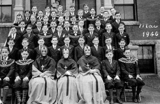 Catholic schools in the States are type of private school, although a very specil type. The sitution in Canada id different, a kind of hybred because there is no Constitutional separation of church and state. There are some private Catholoc schools, but most are this kinf of state-church hybred. This situation is seen in several European countries, including Britain. The Catholic schools are especially important in Canada, particularly in French-speaking Québec. Americans will be somewhat confused by the fact that in Canada there were Catholic public (state) schools as well as Catholic private schools. Boys there never seem to have worn smocks as in France itself. We have received a variety of different commnents about uniform policies at parochial schools. One reader tells us that boys at parochial schools did not wear uniforms, at least in the early 20th century. We note boys wearing simple uniforms in the early 1940s. A Canadian reader tells us that school uniforms were adopted at Catholic schools, although they were discontinued in the 1960s. Another French Canadian reader writes, "Uniforms have been required in Catholic schools for years. You know, Brothers and Sisters were themselves in uniform and the first community of woman in New France went here at the first years of the colony around 1608. When an adult is wearing a uniform, he will require the same from children. A a matter of fact, uniforms disappeared in Catholic schools when Brothers and sisters were replaced by young teachers in miniskirt . When religious communities were at their peak from 1890 to 1960, there was a different uniform for different schools held by different communities."