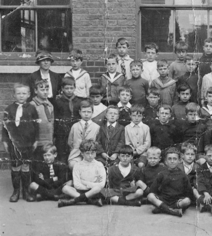 The peaked school cap was still ubiquitous. Boys in state schools still tended to dress up in suits, but did not wear uniforms. Eton collars were still very common, but some boys did begin wearing soft collars and ties. Some private schools required Eton collars, but not all. The school onth the previous page did not require Eton collars, but some boys still wore them because their parents insisted. Boys still commoly wore suits to school in both the state and private schools. We see both old-fashioned and modernstyles. Blazers were still primarily sportswear, but by the end of the decade had began to be worn at prep schools. We still see the youngest boys wearing destinctive styles such as the sailor suits we see here (figure 1). Even slightly older boys did not commoly wear sailor suits. We think this is an Anglian Church of englad school which may explain why so many boys are wearing sailor suits. One of the most significant changes was the increasing trend to wear short trousers and knee socks rather than knee pants and long stockings or knickers like the boys here are wearing. We see some long pants even with the younger boys, but this was clearly becoming less common. The popular Boy Scout movemrent was probably an influence here. This trend was most apparenant in the state schools, but was noticeable at prep schools as well. A few public (private boarding) schools still had knickers as part of the school uniform. High-top shoes were still common. Notice that the boys on th previous page are nearly all wearing high-tops, even the boys wearing long trousers, but the master is weaing low-cut shoes. The boys here seem to be mostly wearing high-top shoes (figure 1). Sandals do not yet seem common.