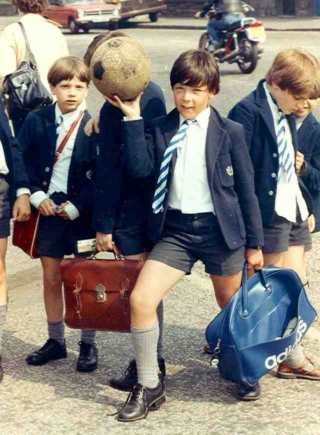 Boys did not begin wearing sneakers (trainers) to school until the late-1970s or 80s, but many schools did not allow them. A British reader tells us, "I think that it was more in the 1980s that some primary schools relaxed the footwear rules and I recall seeing older boys going off to primary school in the more modern trainers that came out then even though the rest of the uniform was still the same as we had worn (essentially allowing for more modern styles. The colours etc. were the same whereas some of the trainers were black with white stripes and so on and later still boys wore white trainers which would have seen odd to us in the 1960s when boy's shoes and plimpsoles were always black - sandals brown).