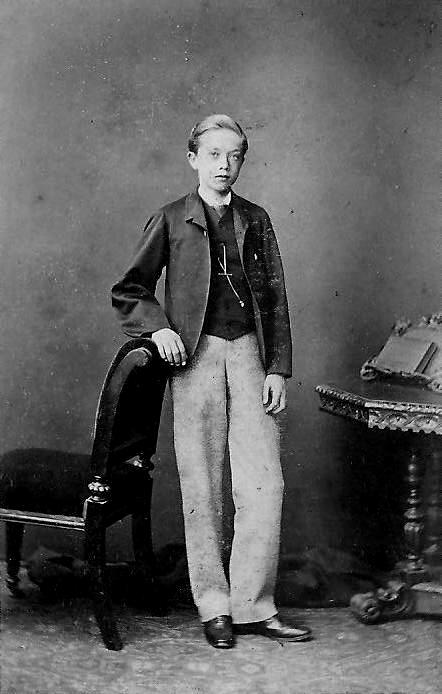 Long pants suits were usually wirn in the 19th century. As far as we know, ling opants were almost universal in the firt half of rge century. The boy here in the 1869s is good example (figure 1). We see many knickers suits in the late-19th century, beginning we think in the late-1870s. We are less sure at state schools, but knee pants suits seem common at primary schools until after Woeld war I (1914-18). Some boys may have worn knicker suits. After the War, knee pants rapidly gave way to short pants suits. Most boys wore short trouser suits. Suits in gneral became common in the second half of the 20th century. Many boys continued to wear short pants to school even after short pants suits became kess common after the 1959s. Schools often mandated shorts as part of the school unifirm. Long pants became increasing common in the 1970s. .