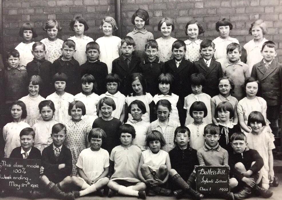 The Butlers Hill Infants School was attached to the Butlers Hill Boy School in Hucknall (Hucknall Torkard), is a town in Nottinghamshire, part of the industrial Midlands. The Clss 1 portait here was taken in 1932. I;m not sure what class 1 meant, I thinbk it was the first year of primary school which would mean that the chilren re bout 6 years old. English schools are a little complicated, at least compted to America where we have grades 1 through 12 in all 50 states. In both England and Wales there are Infant Schools as part of the primary system. This seems ti be schools for pre-school and early primary years. There are some difference, but the schools tend to be small and are for children from 4-7 years of age. They are coed schools. Some Welsh Infants Schools take children as young as 3 years. Children start at an infant school between the ages of 4 and 5 years in a Reception class. The pre-school Receptiom years are not compulsory. The younger children sometimes attend part-time (mornings or afternoons) for the first term. The initial Infant school year represents Key Stage 1 in the English education system. After Infant School, the children will move on to a linked Junior School with the older primary years. In addition to separate linked schools there are also Infants and Junior Schools combined under a single Head Teacher or Principal. This unites both of the schools in the primary system. The Butler Hill Schools appear to be one of these combined schools. In this case the children are separated by gender for the older primary years.