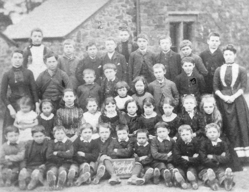 Figure 1.--This cabinent card shows a class at the Westleigh School. We see the school name on the chalkboard the boy in the center is holding. The school is located in Bideford, Devon. Bideford is a historic port town on the estuary of the River Torridge in north Devon. The school is some kind of primary school. You can see it behinf the children. The children look to be about 10-12 years old. The boys wear suits. Some of the girls wear pinafores. One of the nost interesting aspects of this portrait is the hobnails that many of the boys have in their soles. A hobnail is a short nail with a thick head used to increase the durability of the sole. They are usually associated with boots, but were also used on the heavy high-top shoes children wore at the time. The term 'tackety boots' was also used, but more in Scotland than southern England. The purpose of course was to make the shoes last longer. Put your cursor on the images to see the hobnails in their soles.