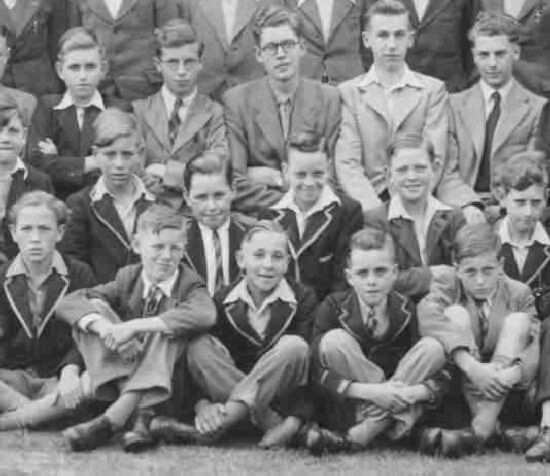 The school blazer was unchanged in the 1950s, but they were no longer optionl. The entire school in 1958 was wearing blazers, both the younger and older boys. Unlike earlier years when many boys wore suit coats rather than blazers, all the boys in the 1950s wore them. Short trousers were no longer optional for the younger boys. All the first year boys wore them. We do not have details on the school rules, but as all the first year nboys wear shorts, we can assume that shorts were required by the school. Almost all of the boys wore the school kneesocks with two dark color bands. Earlier boys had worn all sorts of different kneesocks, but the school appears to be strict about the kneesocks in the 1950s. A few boys in the second year year continued wering shorts, but most boys switched to long trousers. We notice some junior boys wearing caps, but again we do not know what the actual school rule was.