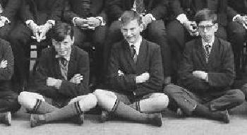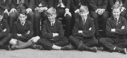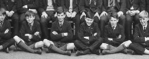 It is not clear if the boys at the school in 1965 wore caps. Although declining, caps were still worn by junior boys at many grammar schools. The boys wore a uniform of dark suits with white shirts and ties. From the photographs it looks like they are wearing black suits. Some boys wear "V"-neck sweaters with colored trim. Some of the boys appear to be wearing grey trousers. The boys wearing shorts are also wearing grey shorts. They also wear grey kneesocks with two colored bands. I'm not sure what the color was. All the boys wear black leather shoes.