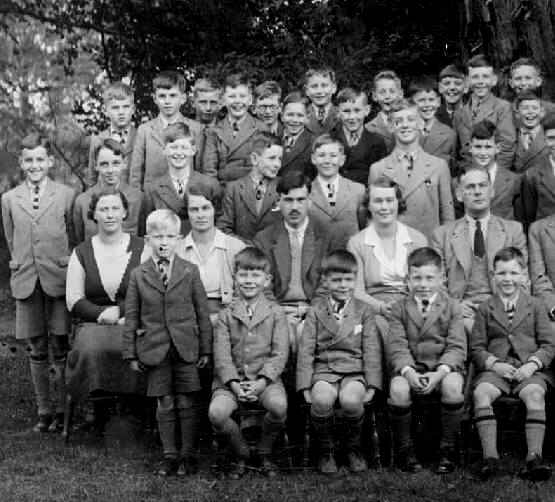 A school portrait in 1935 shows the boys wearing suits rather than blazers. The suits look to be grey, but it is difficult to tell from the black and white photograph. There are differences in the style and color of the suits. We assume that the boys had caps, but they are not wearing them for the portrait. The ties are the old fashioned kind with horizontal stripes. The suits are all short pants suits. The boys wear thrm with kneesocks and leather shoes. Many of the kneesocks bit not all have colored bands.
