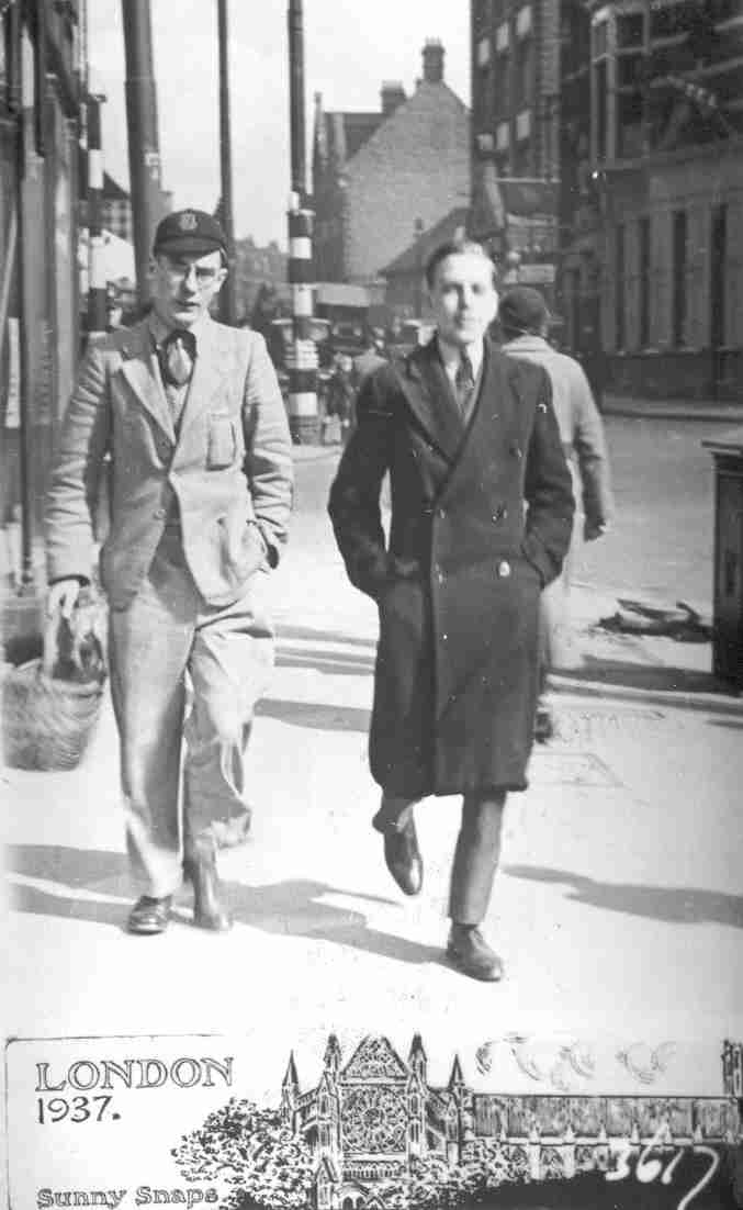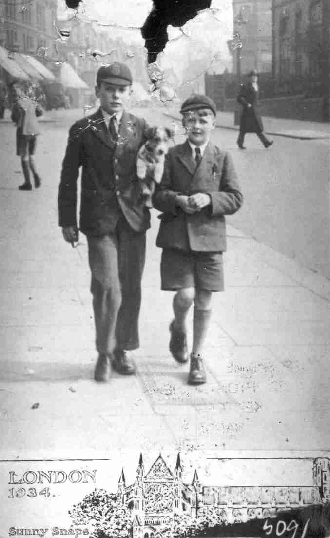 Here we have two photographs of Jack Summers with two different school friends in 1934 and 1937. The photographs were taken at Park Parade in London. A street photographer apparently worked there for many years. His photographs had a mount with the label "Sunny Snaps". Apparently in the 1930s there were photographers who set up at different spots in London and other English cities. I think this was also common in other European countries. It seems to me I have noiticed these photoigraohers in French parks. I'm less sure about America, but have noted them at tourist locations. The photographer here seems to have just chosen a busy city street. I think this becane much less common after World War II. The first photograph showed Jack (1932-38) with Edgar Jones (1933-38) and a dog (figure 1). I'm not sure what the dates in parenthesis mean, perhaps the years the boys were at school. The photograph is un poor condition, but is a good example of these street photographs. Another photograph, apparently by the same street photograoher, shows Jack with Fred Adams (1933-38) a few years later in 1937. This photograph was also taken in Parl Parade and is marked "Royal Oak to the left". I'm not sure what Royal Oak means.