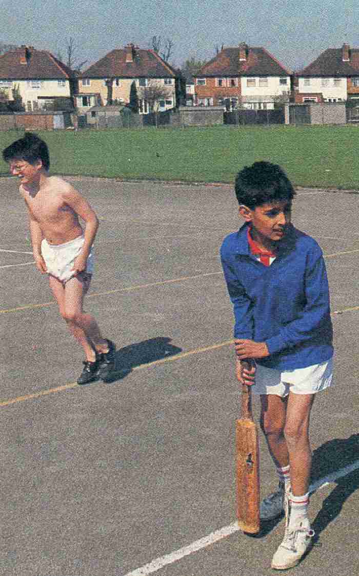 Figure 1.--I haven't any photographs of my experiences with forgotten items - I always kept my kit at school, so it never got forgotten. This 1990 photograph from another school makes my point nicely about forgotten PE kit and what we were expected to do. This looks to me like a classic case of bringing the wrong kit. I surmise that the boy on the left has brought his indoor PE kit (just white shorts) on a day when he has outdoor PE, specifically cricket. The fact that it's at the beginning of the summer term probably explains his error. As it would be unsafe to play cricket barefoot, he has put on his everyday black school shoes, without socks. It looks as if it's quite a warm day, so he's probably more comfortable than the other boy who looks rather warm.
