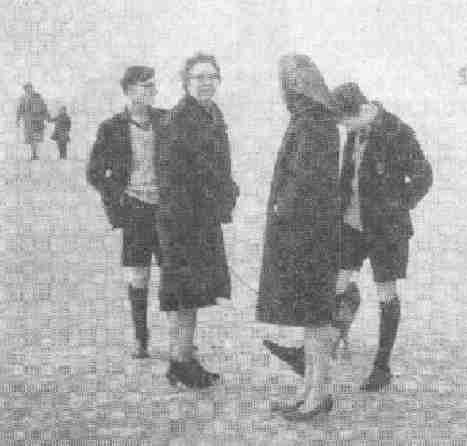 Boys at public schools and prep schools continued wearing the styles set in the late 19th century boys commonly wore peaked caps and Eton collars. Blazers were still mostly sports war. Knickers began to decline in popularity and were replaced by knee pants and long stockings. By the 1910s the short pants and kneesocks introduced by Lord Baden Powell's nasent Boy Scout movement had begun to make inroads at prep schools. State prinmary schools still did not require uniforms. State secondary schools, many of which required fees, did require uniforms, but tended to follow the styles popular at the prestigious public schools. The British school uniform as we now know it became widely worn in the 1920s as soft collars and ties replaced Eton collars. These basic styles have been little changed since the 1920s. The styles were primarily set at the prestigious public schools and followed at state schools. Primary schools did not require uniforms, but clothing styles were strongly affected by hat was being worn at Public and prepartory schools. Boys at state primary schools began wearing the closed-toe sandals to school that had become popular after World War I. State secondary schools were still relatively limited until after World War I. Many of the schools that did exist began requiring uniforms, usually following styles adopted at the public schools. The British school uniform as we now know it became widely worn in the 1920s as soft collars and ties replaced Eton collars. These basic styles have been little changed since the 1920s. The styles were primarily set at the prestigious public schools and followed at state schools. Primary schools did not require uniforms, but clothing styles were strongly affected by hat was being worn at Public and prepartory schools. Boys at state primary schools began wearing the closed-toe sandals to school that had become popular after World War I. State secondary schools were still relatively limited until after World War I. Many of the schools that did exist began requiring uniforms, usually following styles adopted at the public schools. While the styles adopted by schools in the 1920s continue to be worn in the late 20th century, there have been some changes. The peaked caps once so common virtually disappeared. The school sandals once worn with a narrow center strap now mostly have wide straps and look more like shoes. The major change was in the trousers worn by boys. The baggy shorts still common in the 1950s had by the 1970s become much shorter and trim fitting. While secondary schools generally dropped requirements that boys wear shorts, they were still widely worn in preparatory and primary schools. Many of these schools in the 1980s, however, dropped the short pants requirement intirely or at least for older boys. Short pants by the 1990s much less commonly worn, but there are still some schools that continue to require them for the younger boys. The shorts that are worn by the mid-1990s had become longer. One destinctive characteristic of the 1970s was the long hair that was popular.