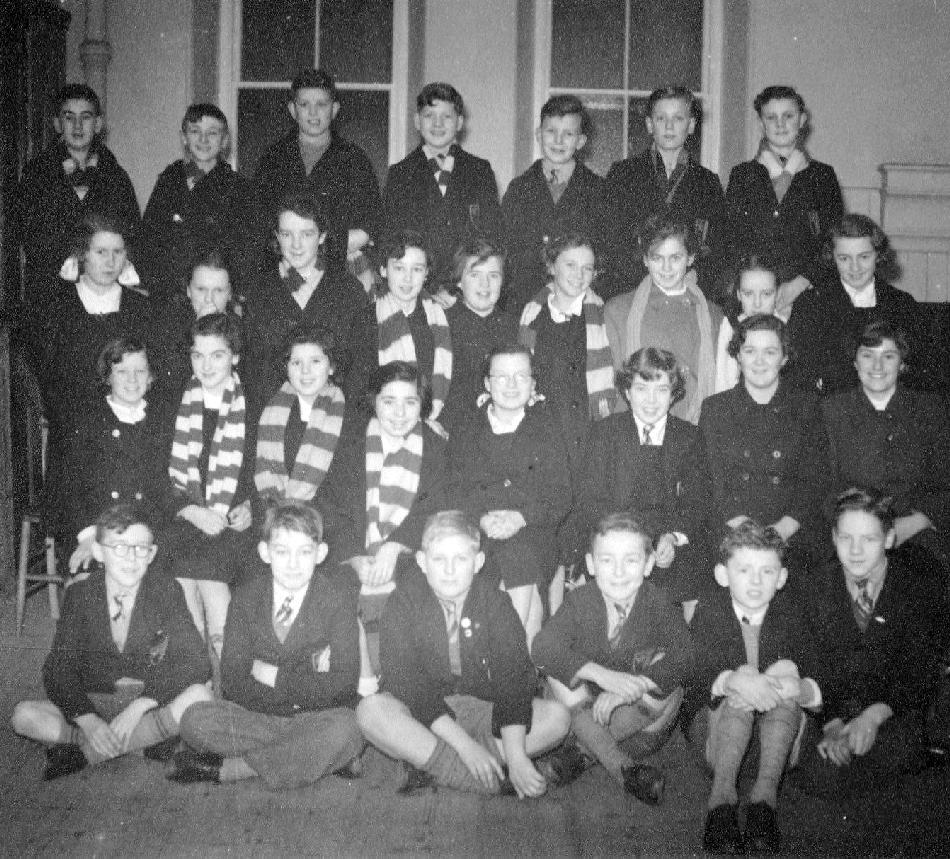 This looks to us like the second or third year of a secondary school (figure 1). The children look to be about 13 years old. We would guess that it was taken in the 195os. It is definitely not a primary school because of both the ages of the children and their uniforms. Nor do we think it was a prep school. Not only were most prepschools single gender schools, but the girls tended to go on to their senior schools 1-2 years earlier than the boys. So I think we are talking about a public (private boarding) schools or a grammar school. A British reader tells us, "I think it is a grammmar school. The students are probably having a photograph taken before they go on an education visit." The portrait is interesting in that coed schools were not all that common at the time. Something else we don't undrstnd about this portrait is that many of the students have their winter clothes on even though they are indoors. We have never seen this bfore. The only thing we can think of to explain this is Brtain economic problems in the 1950s. Britain at the end of World War II voted in a Labour (socialist) government. They intoduced a wide range of social welfare and economic policies, including the nationalization of basic industry. As a result, Britain did not recover from the War as rapidly as other countries, including Germany. As a result, Britain had to maintain World War II rationing into the 1950s. There were wdespread hortages, icluding coal. Perhaps the school was not able to heat the building properly.