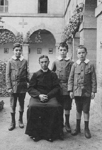 Figure 1.--These French boys at a private Catholic school, probably a boarding school, wear Norfolk-style suits with knee pants and white Eton collars. Notice the ankle socks rather than the more usual long black stockings. The photograph is undated but we would giess was talen in the late 1910s or early 20s. |