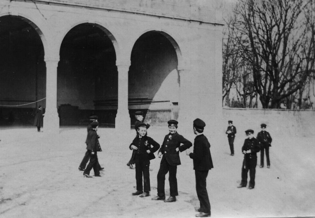 Here we see what we believe to be a French secondary school in the 1900s. The building shows a rather impressive school, but they could be on a school trip. They would have been the juniot students at a secondary school. Perhaps someone with regonize the building. Most secondary schools at the time were single gender schools. The photograph is not identified or dated, but it looks to be the 1900s. We think it is French because all the names written on the back are clearly French names. It could be a Belgian school, but French is more likely. The boys wear cadet uniforms, but it probably was not a military school. as part of the desire to toughen the national character after the disaterous defeat in the Franco-Prussian War (1870-71). Most boys French secondary school had military-styled cadet uniforms.