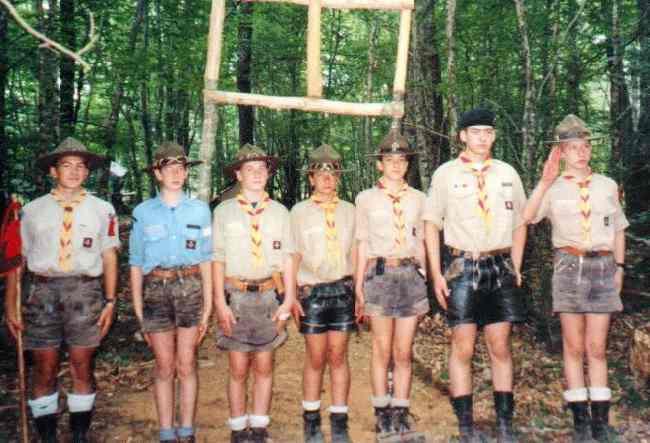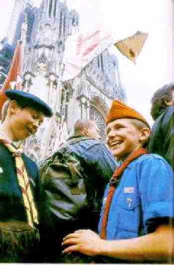 The Scouts in Liévin did not at first wear lederhosen. They followed the uniform guidelines of the Scouts of France. After 1965, the Liévin Scouts separated from the Scouts of France. Father Revet helped form a new association, Scouts of St. George--rather like the Baden Powell Scouts in England. The St. George Scouts adopted lederhosen as pat of their uniform.