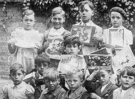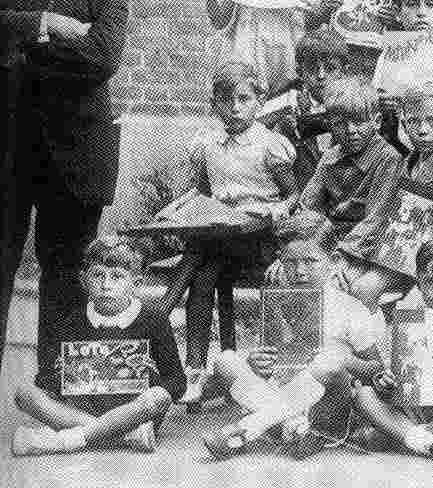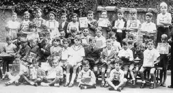 A photograph of the boys at a primary school in 1947 show them receiving their prizes for superior work. HBC believes rthat the children dressed up for the occasion. Many probably did not wear their suits to school every day. It is likely that on a normal daty many more boys would have work smocks. They have received games and toys for their hard work.