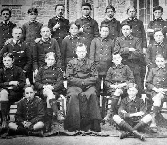 boarders. Two boys standing together have a rather Napoleonic pose with their hanfs in their jackets. Most of the boys wear the uniform jacket with short pants and