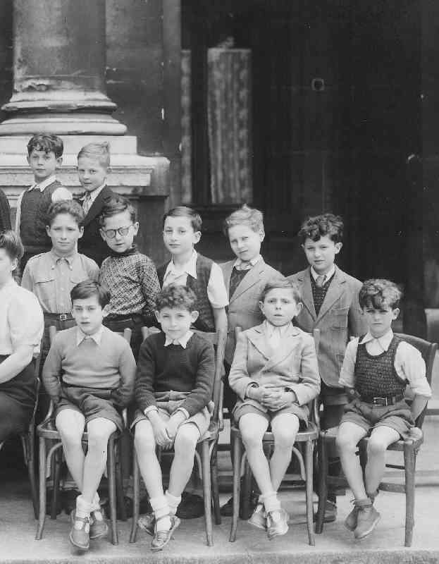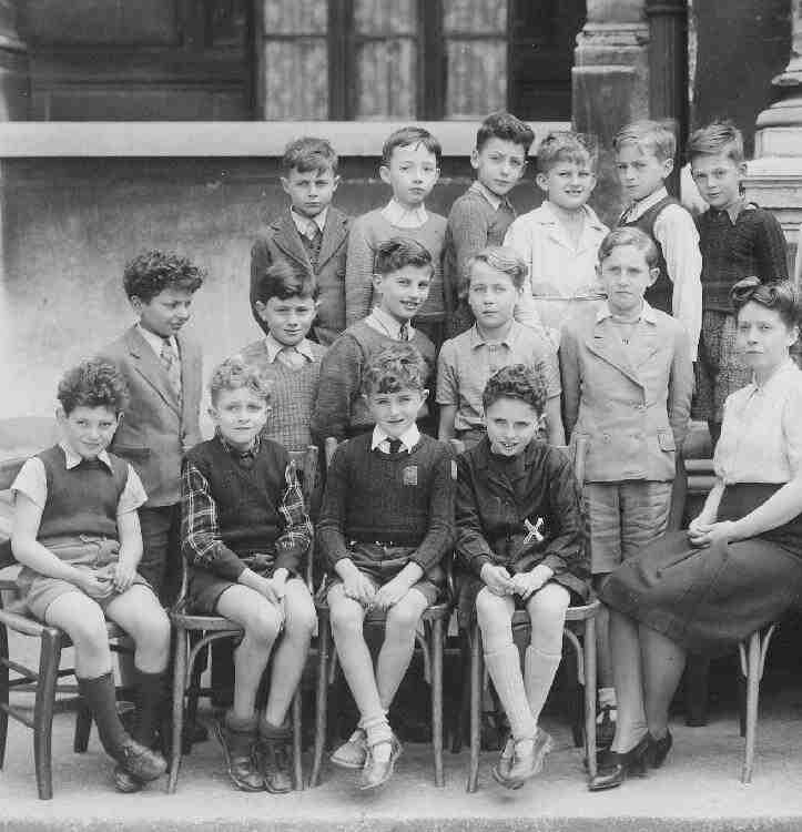 Many French school childeen until the 1960s wore school snocks. Smocks especially at this age were commonly worn at some French schools. This was not the case at this school. Only two boys here wear smocks. I thought smocks were more popular at the time. Both boys wear the same front-buttoning styles, but in different colors. I'm not sure how to interpret this. We have seen schools in the 1950s where large numbers of boys wore smocks. But this varied widely from school to school. It looks like that unless the school encouraged it, few French mothers sent their boys to school in smocks. Or perhps smocks declined in popularity during the War. Perhaps our French readers will have some insights here.