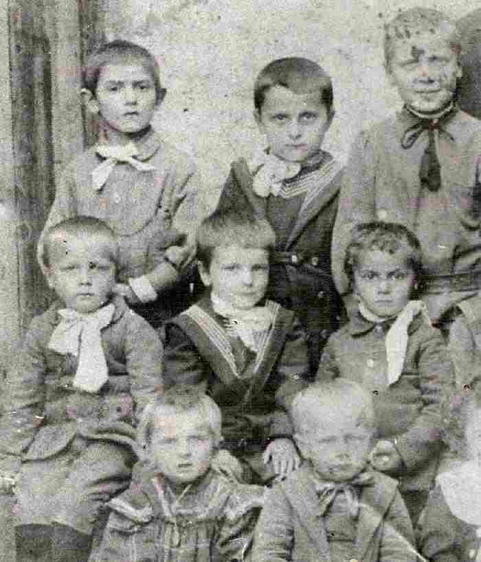 Note that none of the children wear smocks. Neither the boys or girls appear to be weaing smocks. We are unsure, but there may be one exception, the older boy at the upper right here. A reader points out that he seems to be wearing a light-colored smock (figure 1). He may well be correct. We have seen many French schools where virtually all of the children wear smocks. We are not sure why the children here are not wearing smocks. Perhaps smocks were not widespread at this time, but they were introduced by the new French Republic in the 1870s and we thought they were widely worn. Perhaps they were not very common in rural schools. We know smocks were very common in rural schools by the 1920s, but we are less sure about the 1900s. Perhaps the children dressed especially for the portrait or took their smocks off for the photograph. Here we just are not sure anf hope our French readers will have some insights to add. Notice that wo of the younger children wear belts with their dresses, giving them a smock look. We suspect that both are boys.