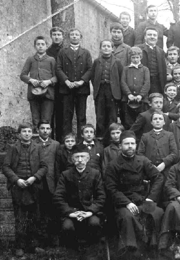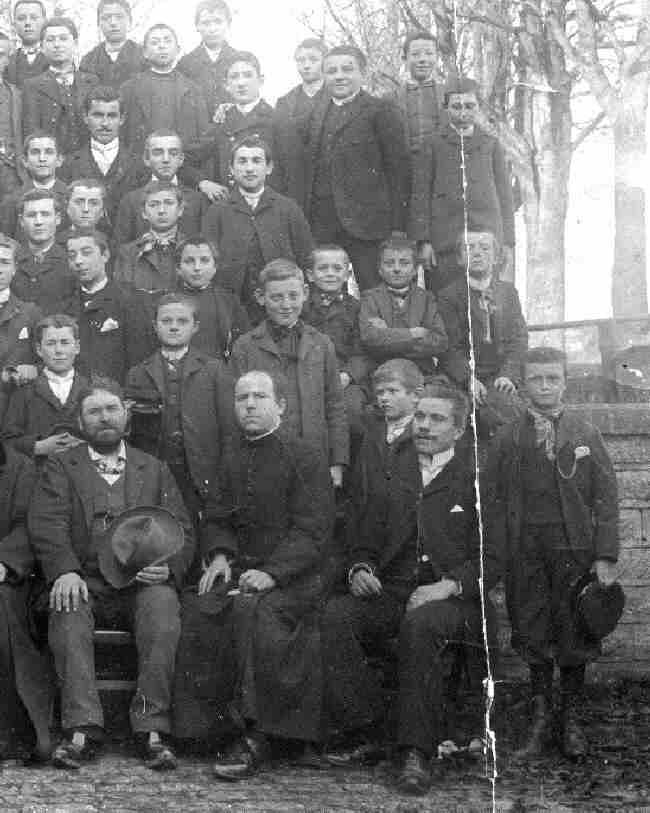 We see the boys still wearing suits in the 1900s. A few boys have military-style caps, but they do not seenm as common as we noted in the 1890s. The boys are wearing sack suits with lapels, The lapels are still set quite high. Most boys have white shirts with collars and various kinds of neckwrear. We see boys wearing knickers and more commonly kneepants. Given the way the photograph is set up, it is difficult to determine which kind of pants are more common. We suspect thst most boys are wearing long pants. Notice the boy at right. He has a knicker suit which he wears with a floppy bow. Note that he iis holding a military-style school cap. While the boy here wears knickers. Most of the boys seem to be wearing long pants. This rathjer surprised us as we though that knnepants were very common in France for boys during the 1900s. We suspect that in an urbsan school, many more boys would be wearing kneepants or knickers, especially the younger boys.