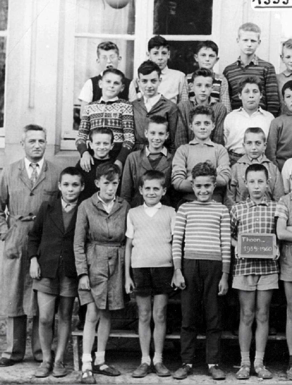 Another class portait was taken in 1960 of the older boys at the school. They look to be about 10-11 years old. It was taken during the 1959-60 school year, but as the boys seem dressed for warmer weather we suspect it was taken during the late-spring 1960. A few boys wear light sleeveless sweaters and short-sleeved shirts. We also see a few boys wearing smocks in 1960, but fewer than earlier. All seem to be the front-buttoning labcoat style. It is unusual for there to be such similarity when the smocks were not required. Perhaps they were the only styles for boys available in the shops. We believe that girls at the time still wore back-buttoning smocks. The teacher wears a similar smock. Short pants were common in both photographs. Many of the boys in 1960 wear sandals. The weather looks warmer than in the 1950 photograph. Thus seasonality along with age and chronology are factors in the different outfits the boys are wearing. We note many boys wear knee socks with short pants in 1950, but not in 1960. The shorter cut shorts or fairly standard. British boys at the time still wore longer shorts. Only one of the boys in 1960 wears knee socks. This could be the seasonality, but knee socks were declining in poularity with boys by 1960. Only one boy wears long pants. He may be an Algerian boy. We begin to see more French boys wearing long pants at school during the 1960s. None of the boys wear ties, but a few boys have buttoned their collars.