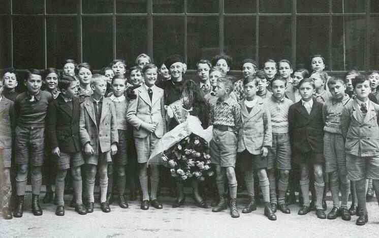 name of the school, but it obviously was a boys' school. I've thought I had archived this image earlier, but can't find it at this time. The boys seem to be about 9 or 10 years old, which would be the equivalent of the 5th grade in America. All of the boys wears short pants with knee socks, most wear suits while a few wear sweaters. Some wear shirts with neckties. This seems more formal than the ways boys dressed at a state primary.