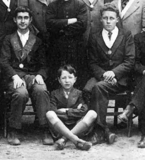 As Les Congréganistes is a mixed age group, all the different types of clothing worn by the boys appears in this group. The boys wears suits with long pants, knickers and short pants. The older boys wear eldegant dark suits with ties. Only one boy can be seen with a knicker suit, but there are probably others. Notice how long and baggy the knickers are. The younger boys wear short pants suits. The boy second from the left is the younger boy in the Retoric class where almost all of the boys, who are older than he, wear long pants. Some of the boys wear short pants suits while others wear a blazer or sports jacket weith shorts. Notice the one boy at the left wearing a dark blazer and white short pants. One sitting in front wears Englsh school sandals. All of the boys in knickers and shorts wear kneesocks.