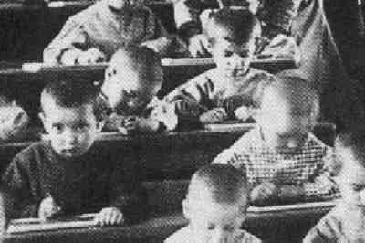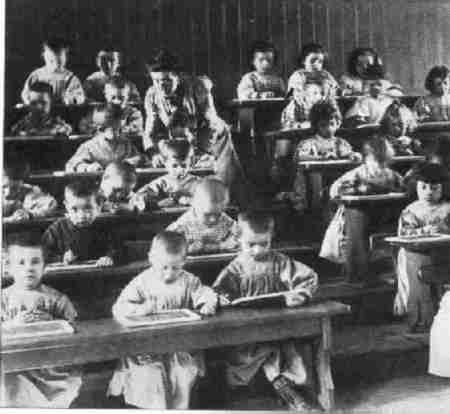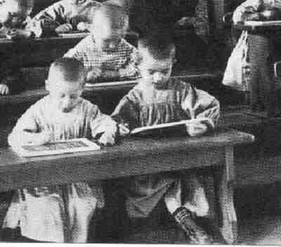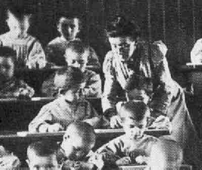 The children in this class appear to be quite young, anging from 2 to about 6 years of age. This could well be the new entrants class. Notice how the boys and girls are seated separately, boys on the left and girls on the right. Also notice the step arrangement of the seating, rather like a theater. It does not apopear to be an ideal class for little ones. Seated in benches, that can't move around easily. Clearly they are meant to sit in their places and pay attention to the teacher at the front of the room. The teacher is shoen here moving up the isle, but perhaps that is so she can be in the photograph. At any rate, the only children she can reach to assist with their lessons are the chiildren at the front of the class or along the isles.