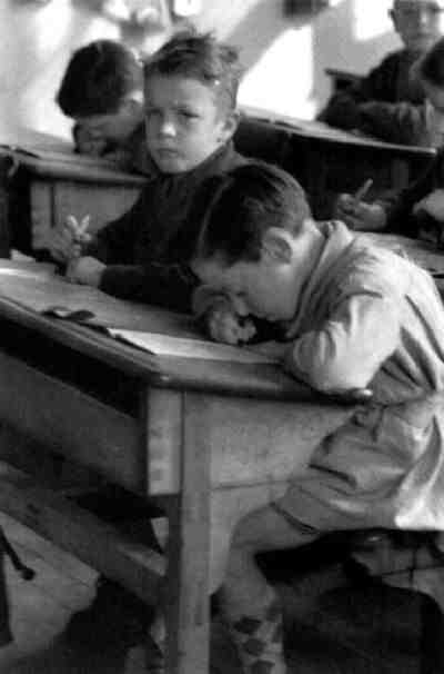 This unknown elementary school was photographed about 1950. Most of the boys wear smocks. A few wear berets. They all wear short pants and kneesocks.