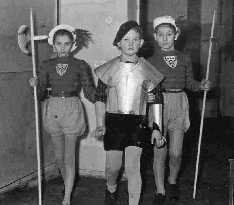Of course, their costumes are not really in accordance with historical setting, but seem reasonable for the school level. The main figure is wearing an armor not some far from the historical perspective. But, the beret , short pants and long stockings are a good indicator of the kind of clothing worn by boys in 1950. Maybe, it could be realistic to believe that this drama took place in East-Germany where children were dressed like this boy.