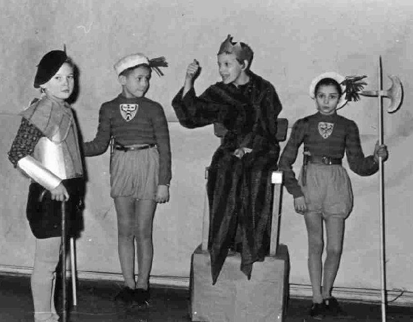 The main figure, a young boy wearing some knight armor, is entering in a kind of court, escorted by two guards. On the second image, what seems to be a king is admonishing or sentencing the knight (figure 1). Is he changing the knight into a horse or a donkey? The third photograph is more dificult to understand. he same boy role paying the knight is now changed in what seems to be a horse or a donkey firmly tied to a ole. I suspect he will be carried by the people leaning him.